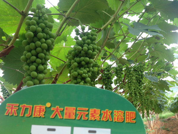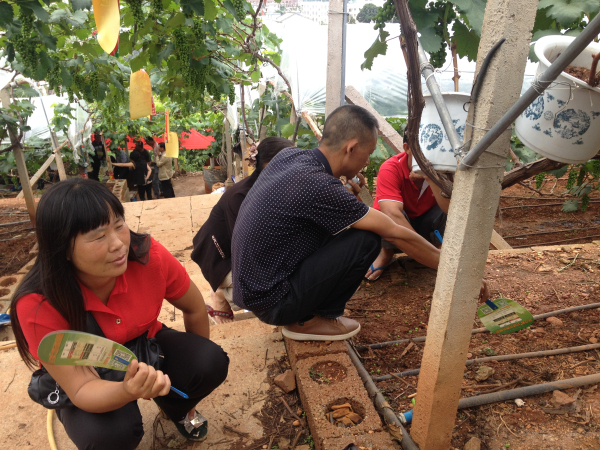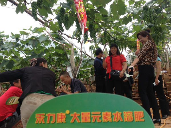 2015年8月30日,在云南賓川柳家灣村公司攜手當地批發商、零售商、基地種植戶、普通葡萄種植戶到田間現場觀摩了夏黑二花葡萄的禾力康水溶肥示范效果。